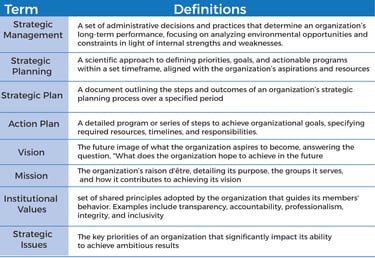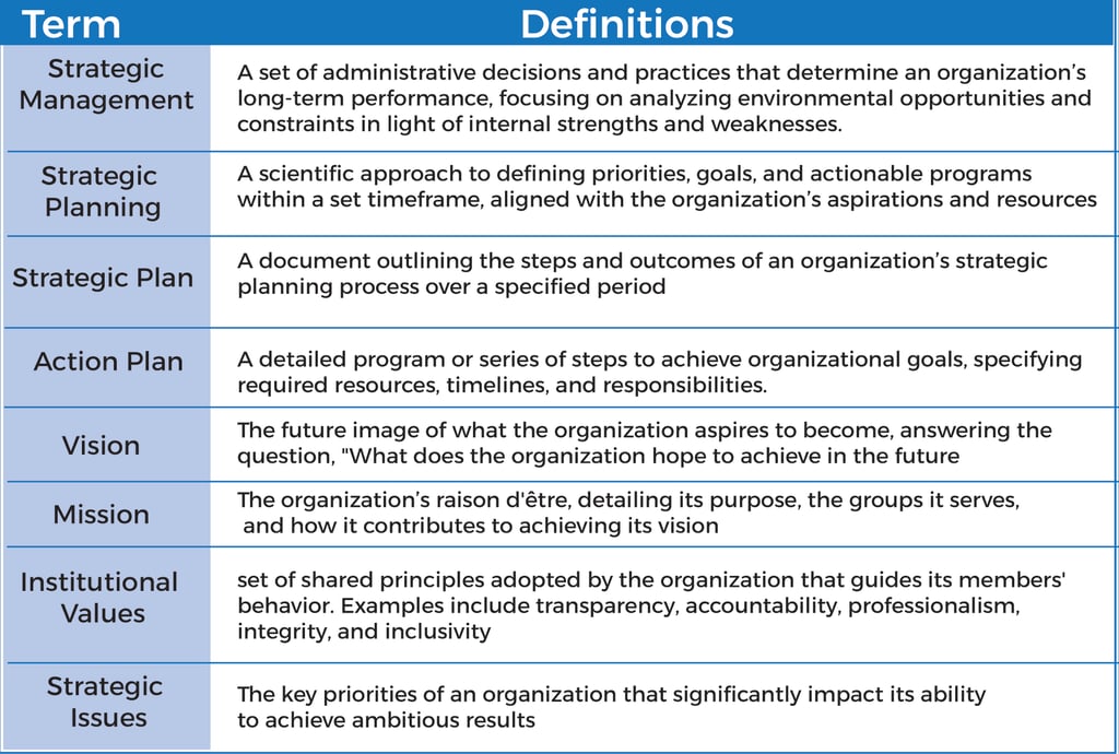 Strategic planning is the backbone of organizational success, enabling them to fulfill their mission by reaching target groups and providing optimal services. It is a management tool organizations use to concentrate their efforts and ensure all staff members move in the same direction, adapting to external environmental changes. Strategic planning involves defining desired goals in light of available resources and devising ways to achieve those goals. It includes setting organizational objectives, developing strategies to achieve them, and implementing related programs.