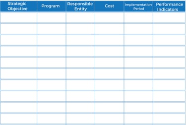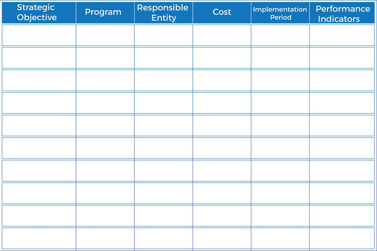 To ensure the effective implementation of the strategic plan, it is essential to develop an implementation plan that includes a comprehensive timeline for executing projects, an estimation of the expected costs for each project, and the executing entity. The implementation plan includes a set of elements as indicated in the model below: