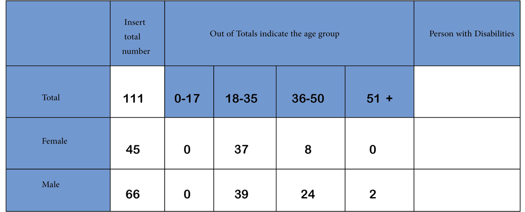 The assessment focused on six youth centers located in Al-Roseries and Al-Damazine localities. These centers were selected because they played a pivotal role in engaging young people and providing essential services and programs. To gather relevant information, an assessment questionnaire was administered, targeting key participants from each center. The selection criteria for participants included various stakeholders who were integral to the functioning of the centers. This included members of the General Assembly, who were responsible for the governance and strategic direction of the centers; staff from the Executive Office, who managed day-to-day operations; volunteers who contributed their time and skills; and youth activists who were actively involved in center activities and initiatives.